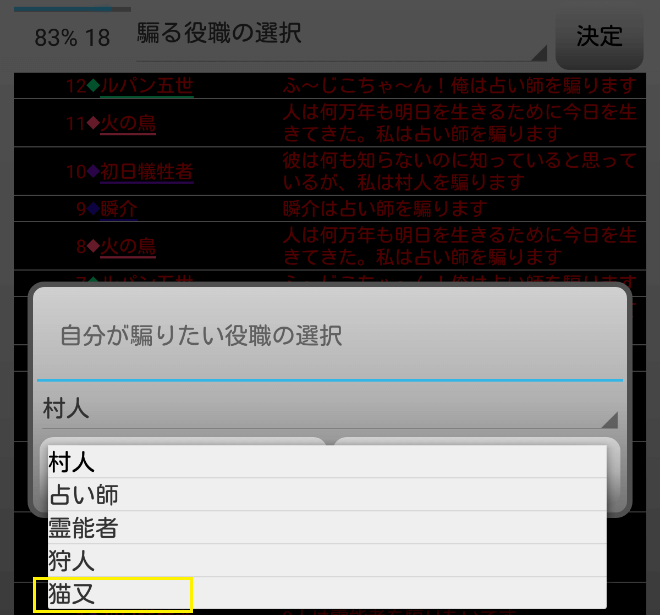 瞬介「あれ!?人狼は猫又を騙れるの(上の図)!?偽猫又になってみたいなあ。人狼AIが猫又COをしたところは見たことないから俺がやるしかない(笑)」