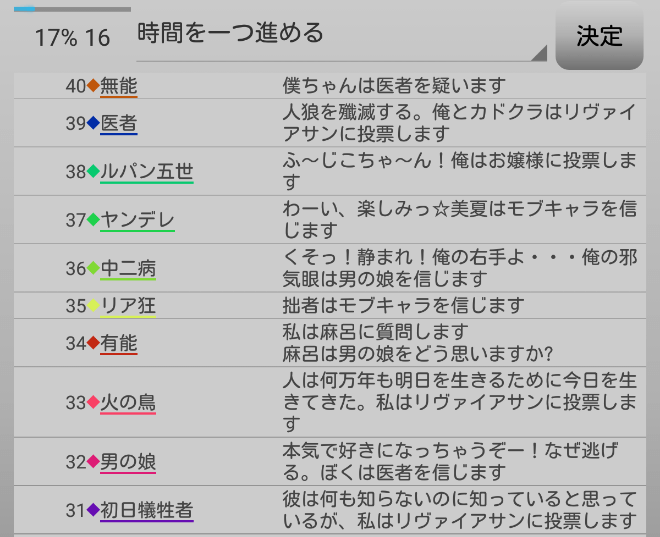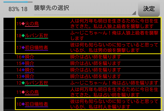 AI達は人狼上級者を襲撃したがっている。俺も同意しておこうかね。人狼上級者は強いから早期に退場させよう。