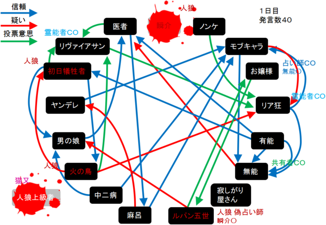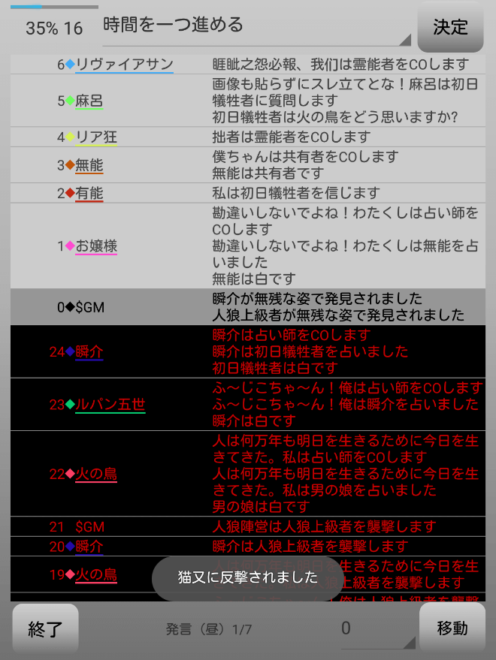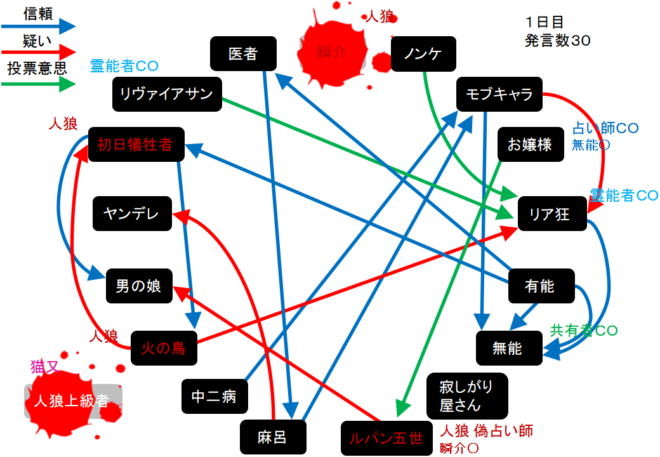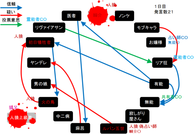 襲撃をした人狼上級者は猫又だった。俺が退場をしちゃったよ!だけどルパンが瞬介○を作っていたよな?俺を呪殺した真占い師だと村は思うんじゃないの?人狼上級者を背徳者だと言い張るのは厳しいけどね。次にいきます。