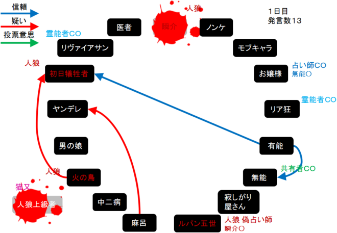 瞬介「相方の人狼は『ルパン、火の鳥、初日犠牲者』だ(上の図)。悪くないメンバーだね。ただルパンは潜伏が下手だから占い師をやってほしいな」