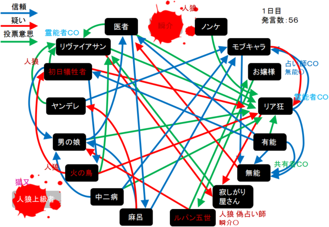 瞬介「初日犠牲者○の占い結果を作りました(上の図)!それでは!猫又との対決が楽しみです。1日目よ来い来い!そいっ!」