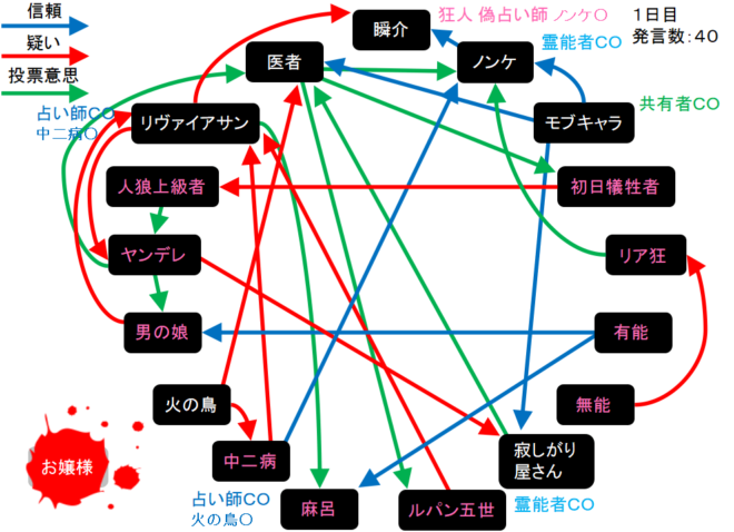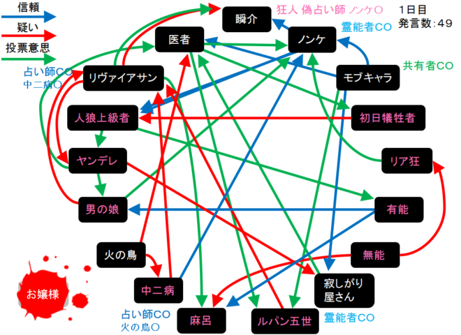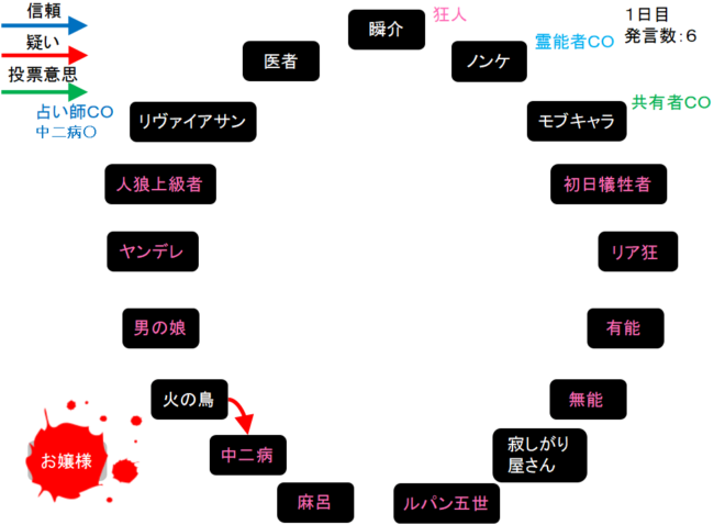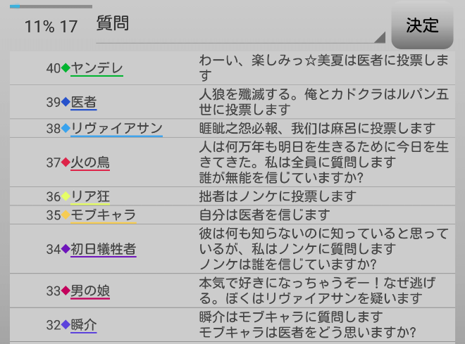 瞬介「なんとなくだが・・・潜伏人狼は初日犠牲者と人狼上級者な気がする(笑)。引き続き質問をします。共有者の『モブキャラは医者をどう思いますか?』」