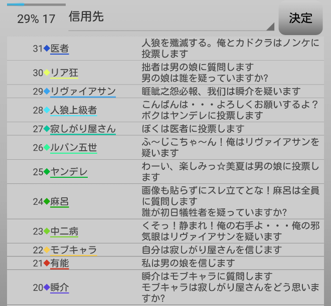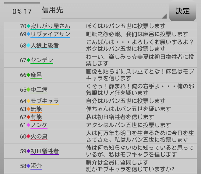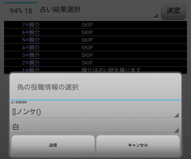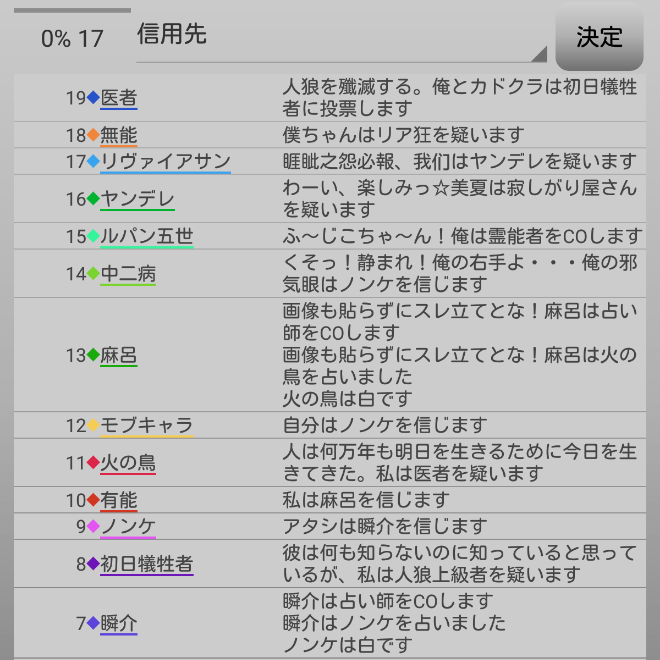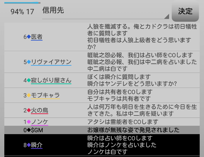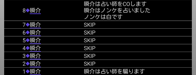 瞬介「占い師COをする準備をしました(上の図)。占い結果はどうしようかな。いきなり●を飛ばす勇気はない。人狼に誤爆したら怖いしCCOされたら馬鹿みたいだしね」