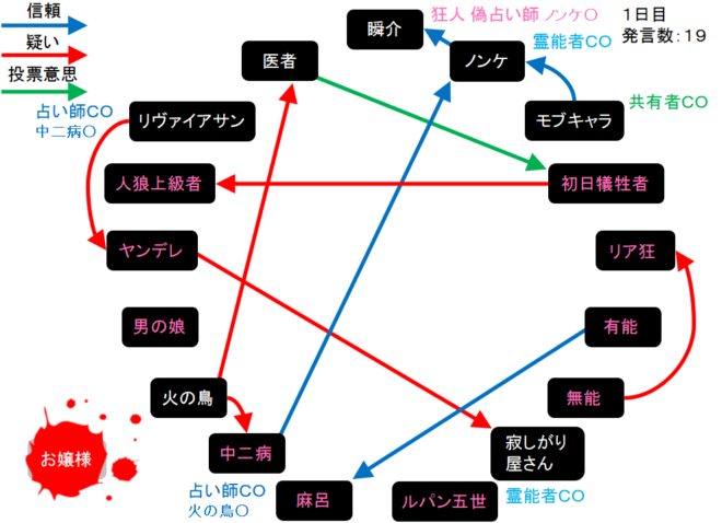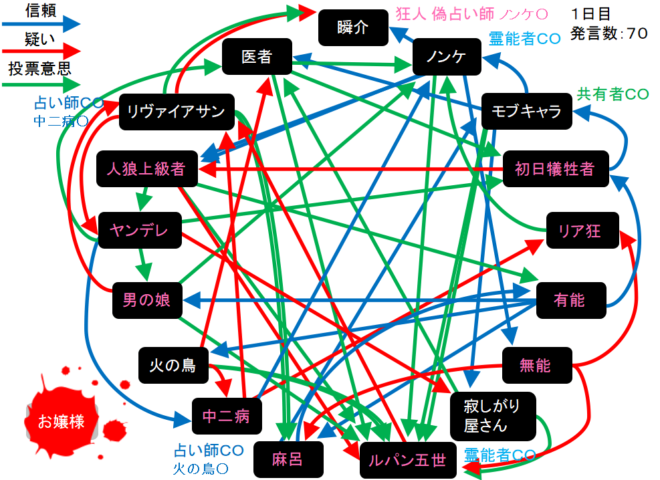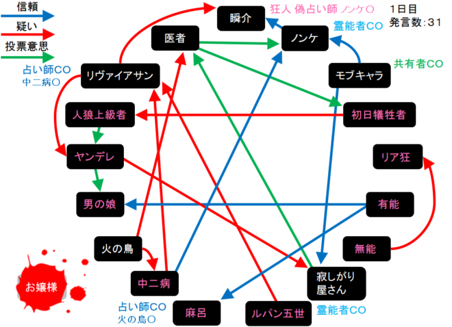 ヤンデレは疑い先と投票先が一致していない。人狼かもしれないね。明日はヤンデレ○を作るものアリかな。人狼の配役は明日にでも判明するだろうけど。