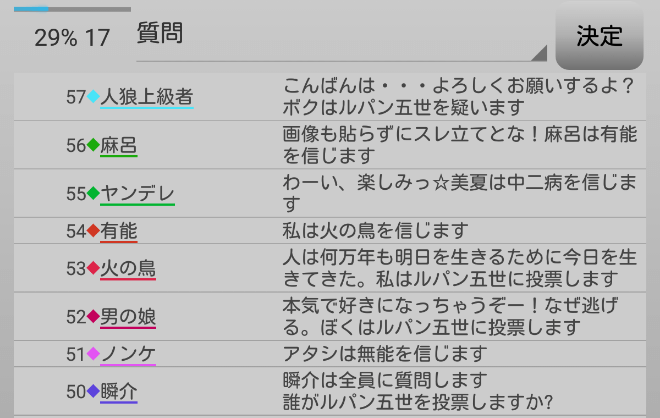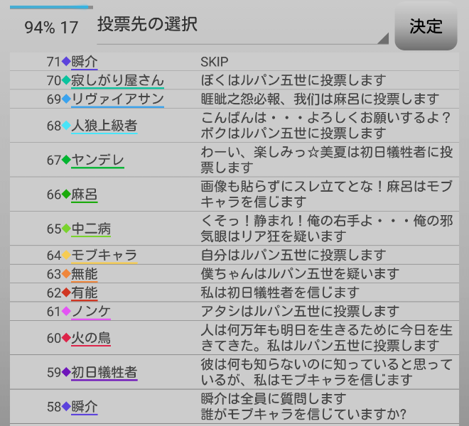 瞬介「人狼候補を絞るために全員へ質問をします!人狼霊能者の『ルパンに投票をする人はいますか?』」