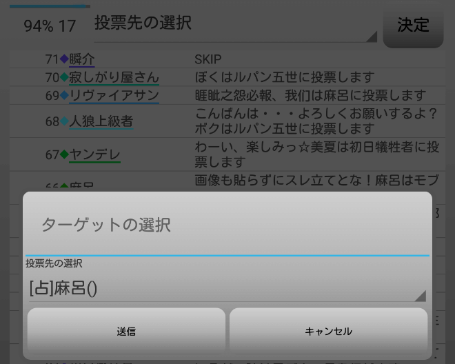 瞬介「議論はこれで終わり。投票の時間になります。対抗の『麻呂へ投票』をしよう。麻呂は人狼だけどね」