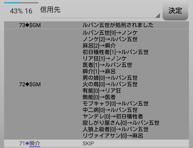 瞬介「初日犠牲者がモブキャラを信頼したか。最後の発言になります。発言したいことは無いので『スキップ』します」