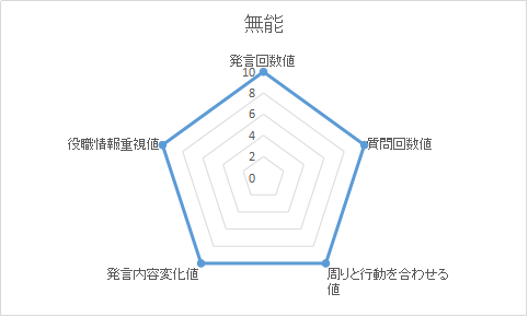 無能はリア狂と同じく1日目グレー吊りの筆頭となってしまったね。基本的に寡黙なんだけど協調性の高いノンケとは違い疑い発言を飛ばしたがる傾向があるので嫌われてしまうのかな。だけど僕は特徴的のあるキャラが好きなので毒舌の無能は好きなんだ。次回からは騙り役職が増えるので無能への投票結果から人外を推理できたりできるかもしれない。9人村では皆一致で無能投票だったけどね(笑)。真狩人にならなければ、そこまで足をひっぱらないとは思うんだけど・・・期待しているよ!