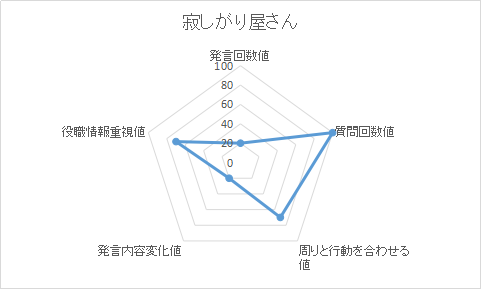 恥ずかしがり屋さんはわりと1日目に吊られていたね。モブキャラとヒロインを足して2で割って悪いところが強調されてしまったという印象だよ。まだ発言傾向が読めないキャラの1人で、騙り人外を担当された際は足下をすくわれてしまうに違いない。発言0で吊られることもあるから素村人だと頼りないかな。僕よりは実力が上だけどね(笑)。