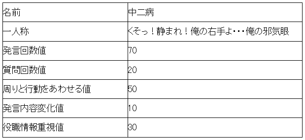 12人村をプレイするために3人のプレイヤーを作成します。前回作成した時と同じように、『最大値1を100』、『最小値0.01を1』と表記して「好奇心」は質問回数値、「勤勉性」は役職情報重視値、「外向性」は発言回数値、「協調性」は周りと行動をあわせる値、「情緒不安定性」は発言内容変化値とします。9人村をプレイしてこの表記は適切ではないと疑問がわいてきました。便宜上、前と同じ表記を致します。ご了承ください。