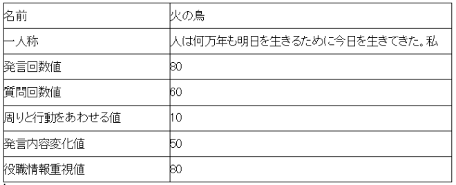 世間には『きのこ・たけのこ論争』というものがあるらしいね。僕は甘い物に目が無いので、きのこもたけのこも両方好きだから論争する人達の気持ちは正直わからない。そんなことよりも『のび太・キテレツ論争』の方で頭がいっぱいなんだよ。キテレツのご先祖様であるキテレツ斎様は世の中を騒がせてはいけないと自らの素晴らしい発明を封印してしまった。先祖をタイムマシンで助けに行ったキテレツはご先祖様を監禁する役人を憎むことになるんだけど、最後はご先祖さまの意思を汲んで自分の力で発明できる人間になるために頑張って勉強を始めるんだ。僕はそのエピソードを知って泣いてしまった。のび太ものび太なりに頑張っているのだろうし、長期連載であるから立派なご先祖様がいたり勉強を頑張るエピソードだってあるかもしれない。だけど僕のなかではキテレツの方がぶっちぎりで上なんだ。最初はキテレツ大百科の登場人物をプレイヤーにしようと思ったけど、こんなに素晴らしい物語の登場人物を吊りだの噛みだのが行われる人狼に登場させるわけにはいかないと反省したのである。だから代役として『火の鳥』に来てもらったのだ。彼(彼女?)はわりと気ままに罰を与えたり苦しめたりする性格だから人狼ゲームを気に入りそうだし、どうやら不老不死のようなので噛まれたり吊られたりしたくらいでは余裕で復活をして許してくれるだろう。何度も人類滅亡・復活を経験しているようだし次の人類滅亡まで暇をもてあましているに違いないとオファーを出したら無事にOKがでたよ。人狼ゲームにおける火の鳥はプレイヤー『有能』のように『発言回数値』と『役職情報値』が高いと強キャラになるのではないかという推測から該当の値が高くなっている。興味がある人間には問いかける場面も見られるので質問回数値も平均より高めだ。理不尽なくらい自分の思想に沿った行動をするので周りと行動をあわせる値は低くなっている。気まぐれみたいに人を助けたり罰を与えたりするので発言内容変化値は予測できない50としておいた。