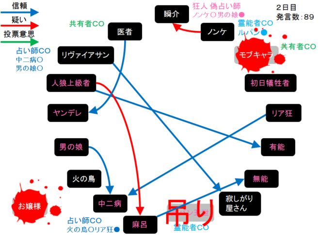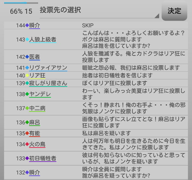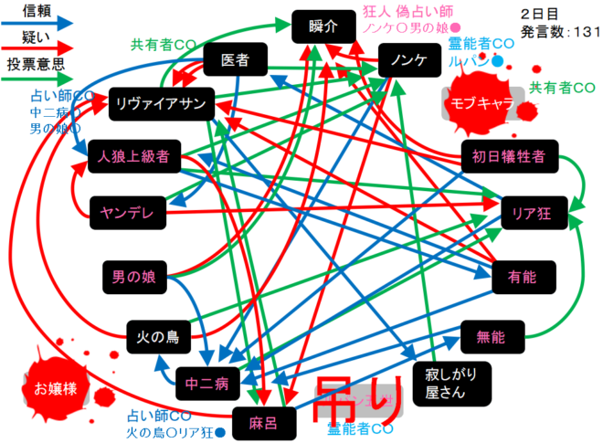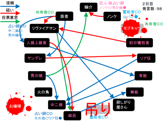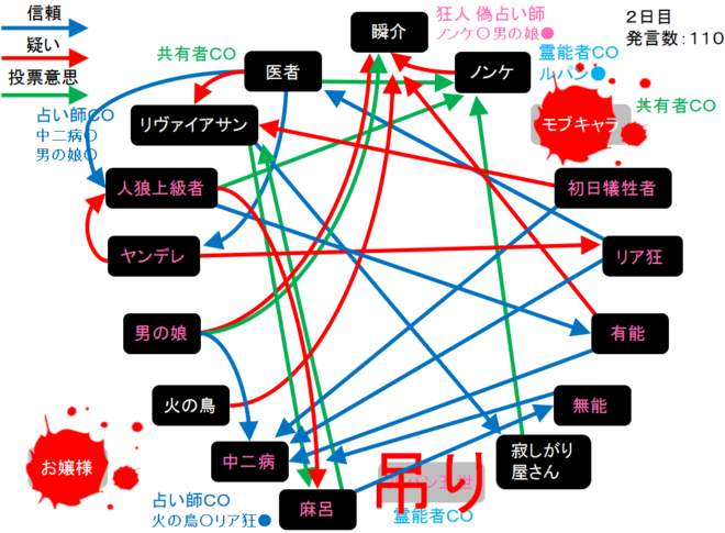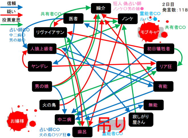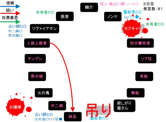 瞬介「2日目の●出しが好調すぎたんだ。結果、妖狐に追い詰められてしまった(泣)。全力で妖狐を探そう。誰か占い師の『瞬介を疑っている人はいますか?』」