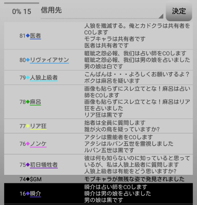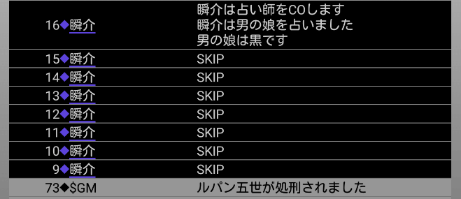 瞬介「俺(占い師)を疑うプレイヤーが何人か現れた。質問による疑い発言だから当てになるか分からん」