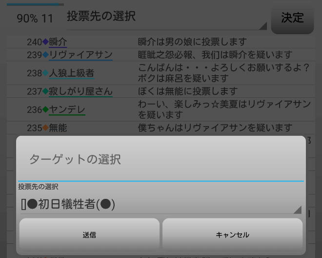 初日犠牲者(得票数2)へ投票をしようか?だけど俺と同じ3票で再投票になっちゃう。