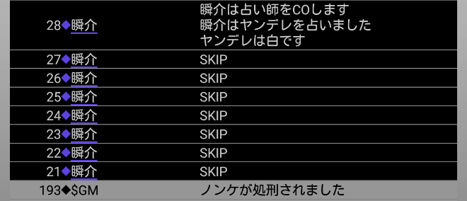 瞬介「それに無能(人狼)は●を出されているのだ。妖狐を気にしていたら人狼達が根絶やしにされてしまうよ。今日は真占い師の処刑を狙ってみようぜ。様子をみたいから『スキップ』します」