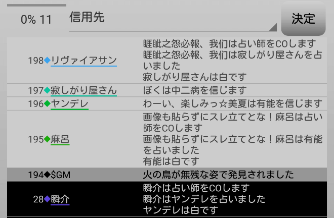 リヴァイアサン(真占い師)は寂しがり屋さんを占って○。潜伏人狼を突き止められずに済んだぞ。