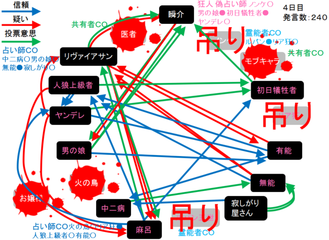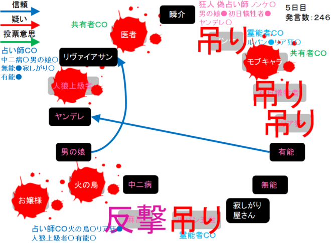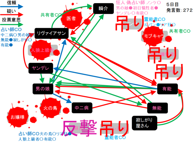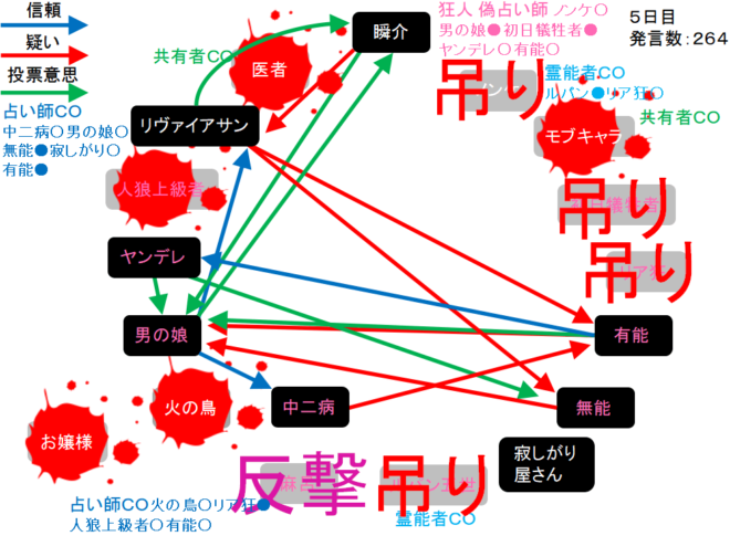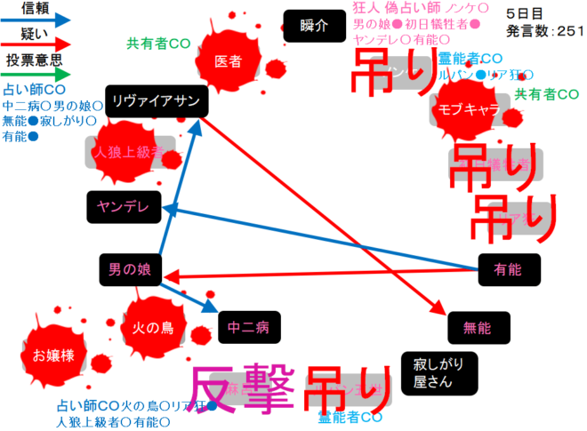 瞬介「有能に○を出す準備をしました(上の図)!それでは!人狼上級者も妖狐っぽいんだよなあ。5日目よ来い来い!そいっ!」