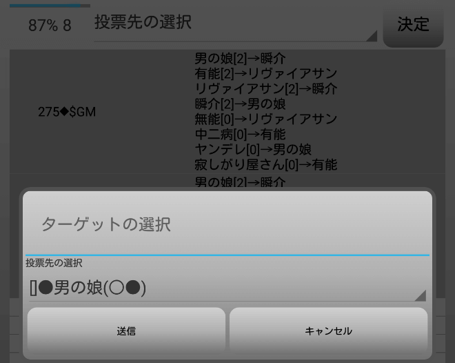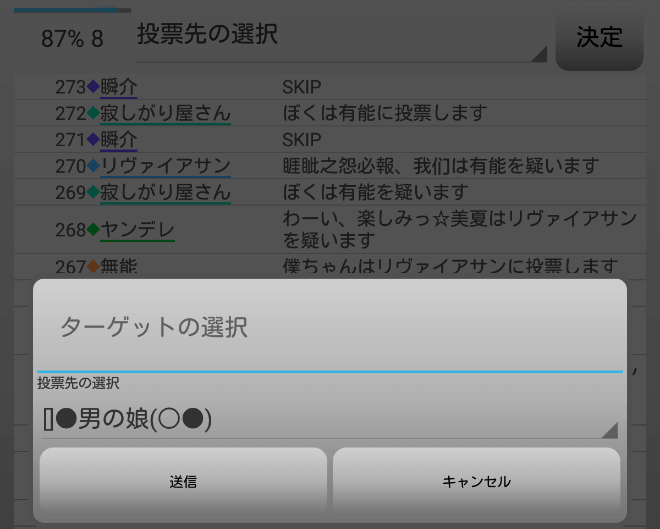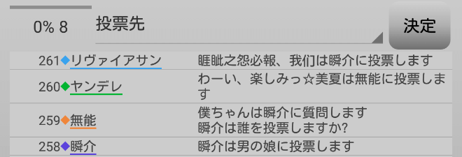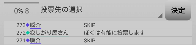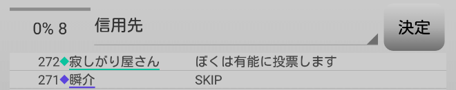 まずい・・・まずい!人狼達の投票先を聞こう。やつらと票を合わせなければ始まらない!『有能は誰に投票をしますか?』。