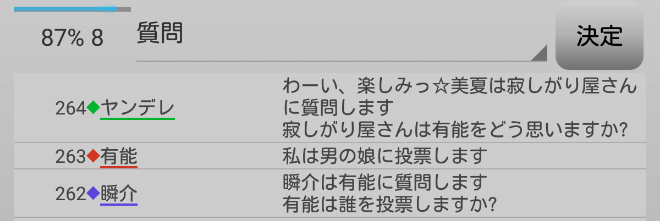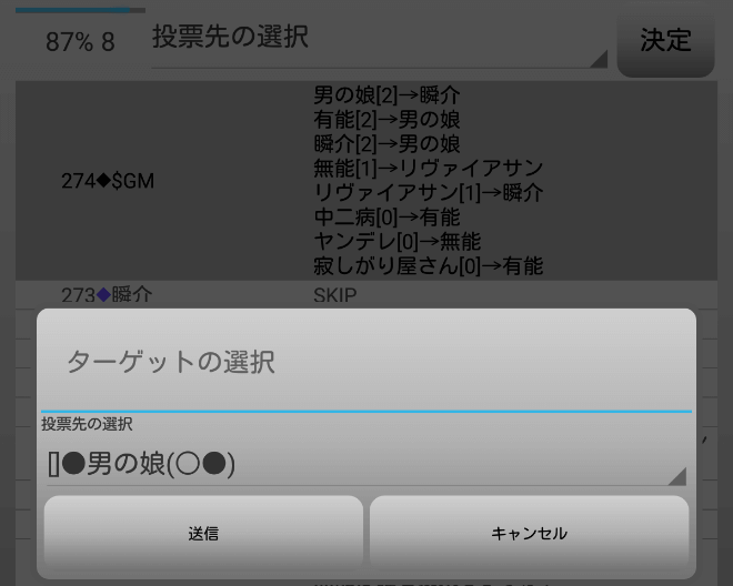 ヤンデレが妖狐じゃなくても、明日は村人6名、人狼陣営3名だから勝てる。今日は・・・男の娘処刑だ!俺は『男の娘へ投票をします!』」