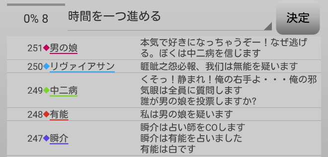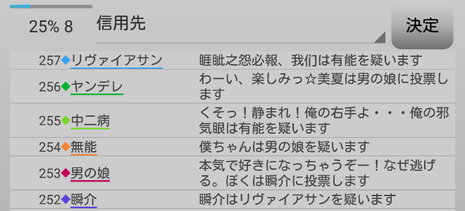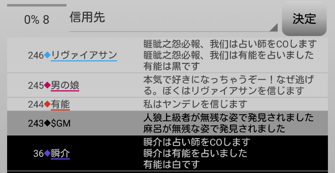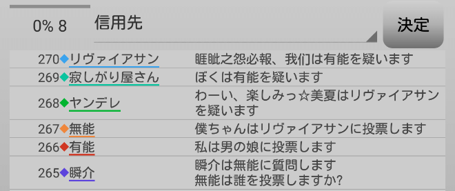 瞬介「やべえなあ。寂しがり屋さんは有能に投票をするようだ。まだリヴァイアサンの●は1人も処刑していないから当り前かな」