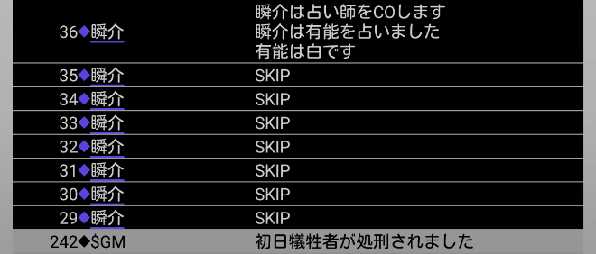瞬介「麻呂(人狼占い師)が退場をした。人狼上級者が猫又だったんだ。人狼上級者○を出していれば呪殺だと主張できたかな(無理)」