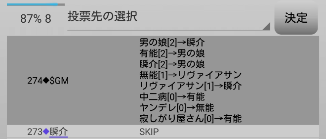瞬介「俺には2票入る。男の娘にも2票入るのだ。再投票でヤンデレの投票先が動くことを期待しようか。『スキップ』します!」