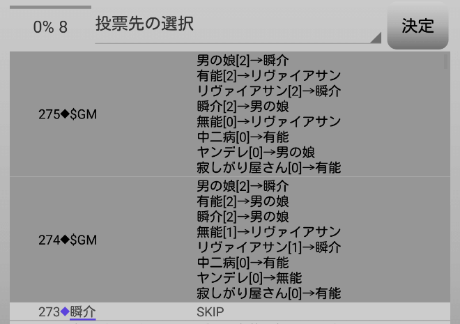 瞬介「議論はこれで終わり投票の時間になります。もう負けたな。猫又に反撃されたのが無能ならば良かったのに。『男の娘に投票』をします!」