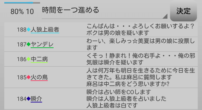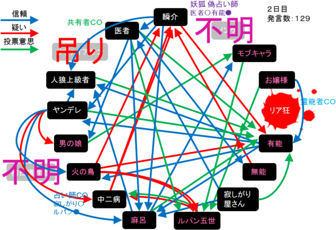 瞬介「真占い師はヤンデレを占ったか。ヤンデレは2日目に中二病を挑発していたからね。たぶん背徳者だろう」