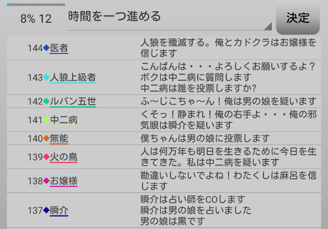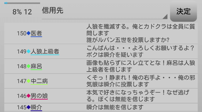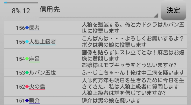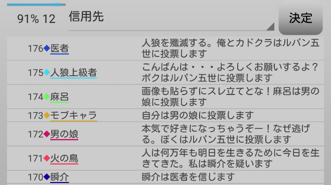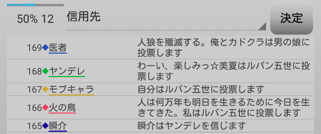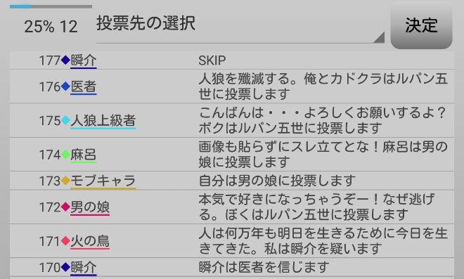 投票が繰り返されることにより潜伏人狼の配役をつかむことができました。まあ、私が考えた配役は間違っていたんだけど(笑)。真占い師がルパン●を提示してくれたのは運が良かったです。