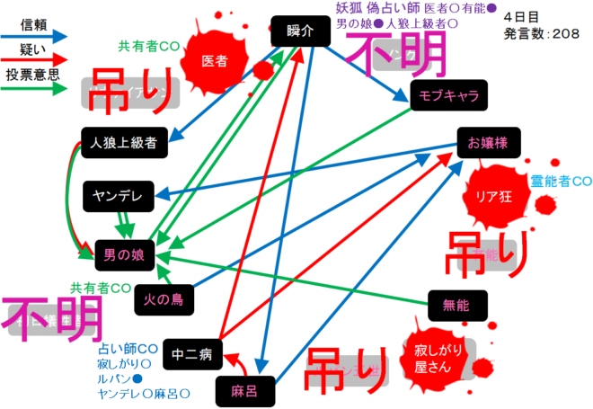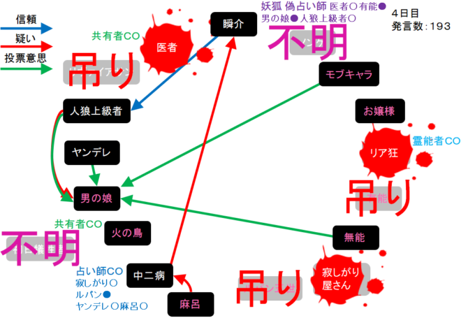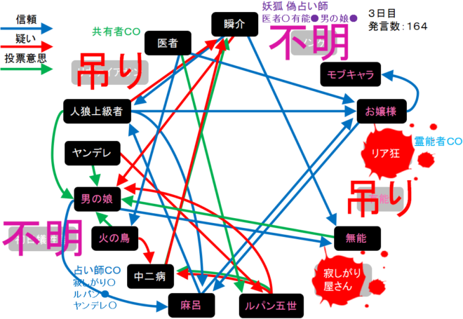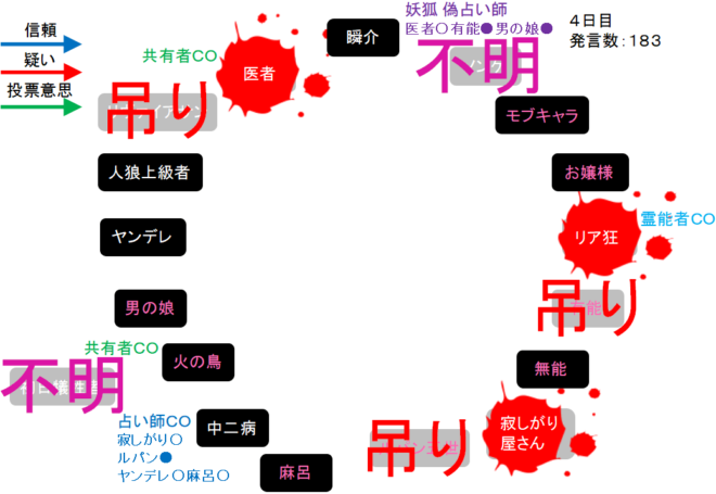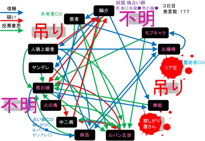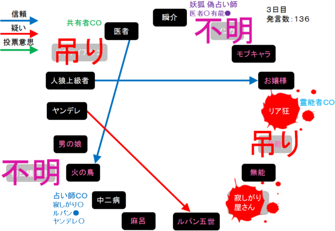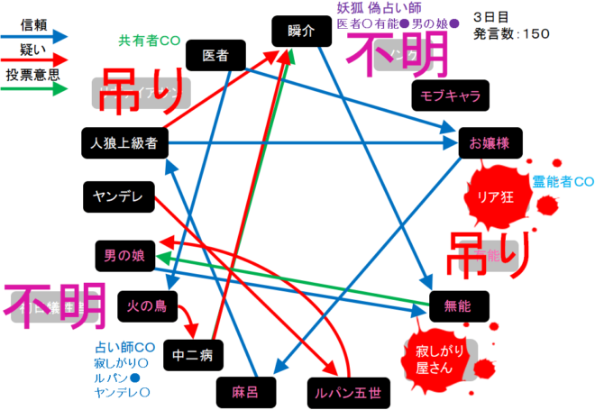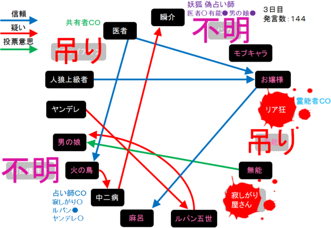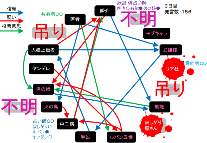 瞬介「男の娘●の占い結果を作りました(上の図)!それでは!発言表の作り方を考え直さなきゃなあ。3日目よ来い来い!そいっ!」
