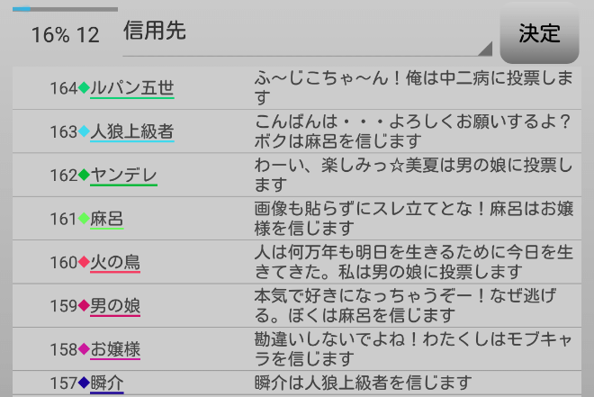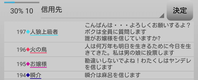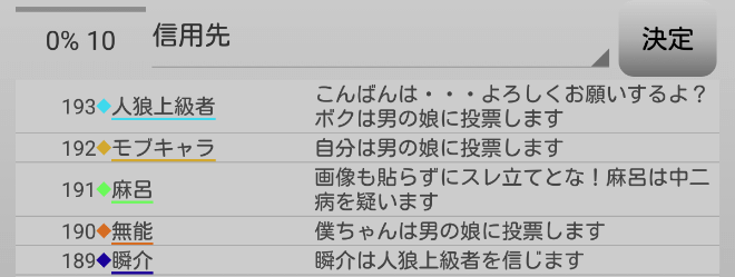 瞬介「よし。グレランの流れではない。このまま信頼関係を築きつつ、LWを処刑してしまおう。俺は俺の○である『人狼上級者を信頼します!』」