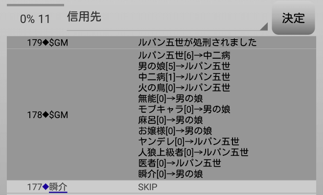 瞬介「念のために明日は人狼候補以外を占おうか。最後の発言になります。意思は示したので『スキップ』します」