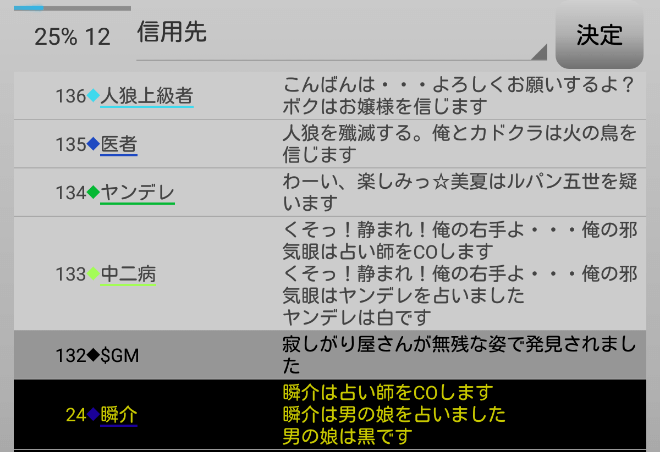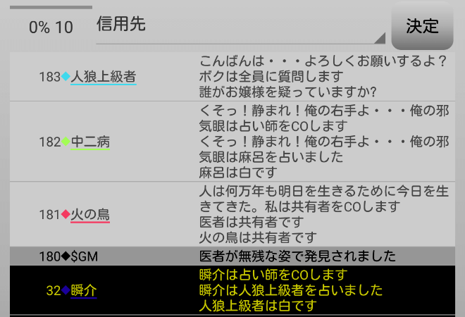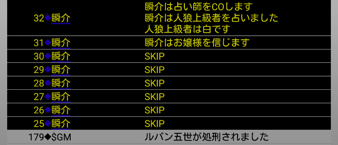 瞬介「グレランとかはやめてください。占い結果を発表します!『人狼上級者を占って○でした!』」