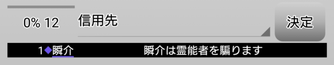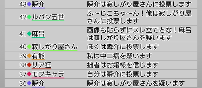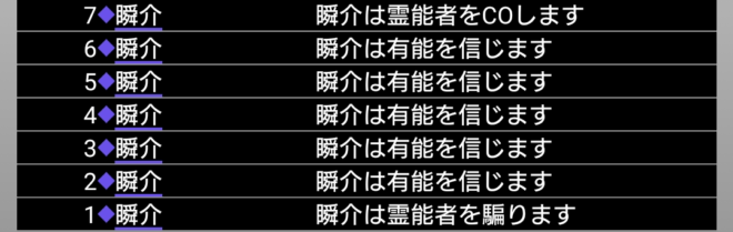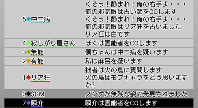 瞬介「いきなり古参プレイヤーが新規プレイヤーへ疑い発言を飛ばしている。こいつら体育会系の先輩みたいで怖いよね(笑)。いやいや、そんなことはどうでもいい。寂しがり屋さんが霊能者でCOしているやんけ!えっと?僕ちゃんも騙り霊能者としてCOした方が良いの!?」