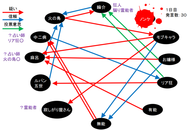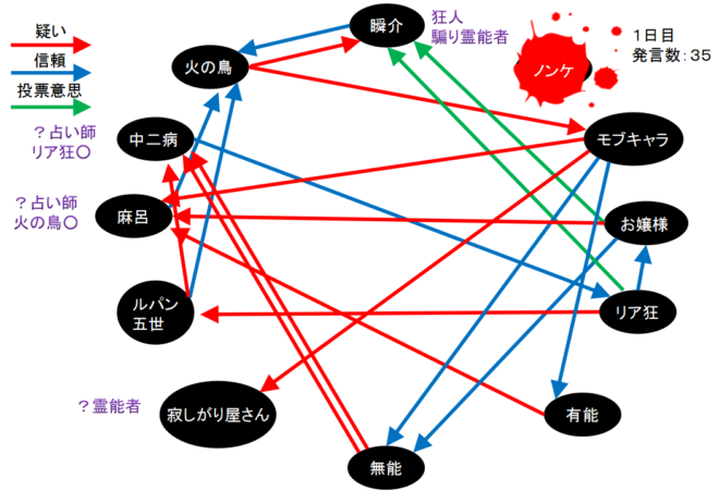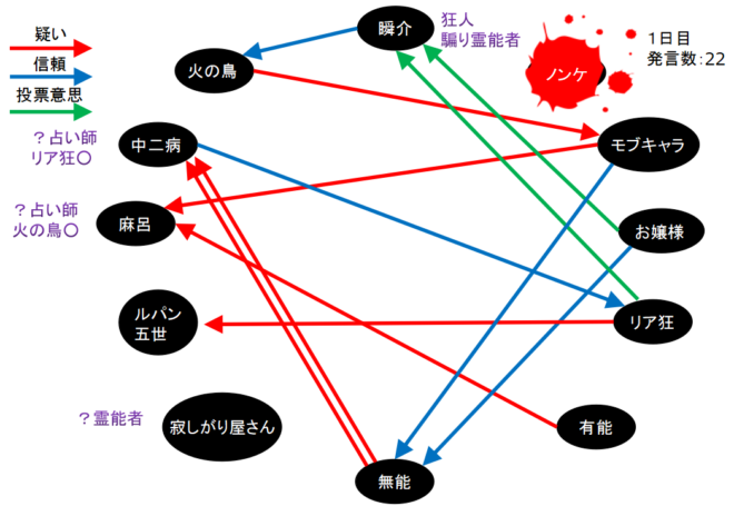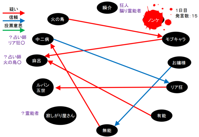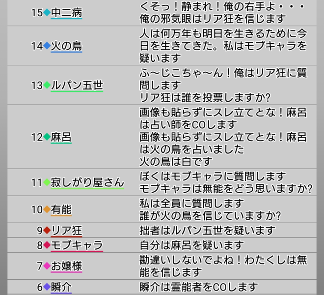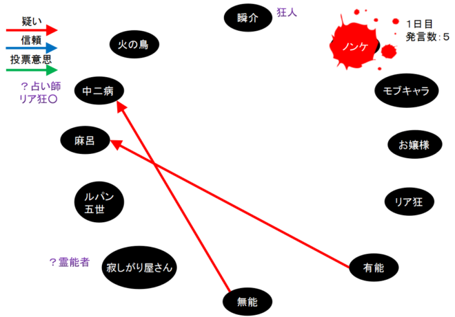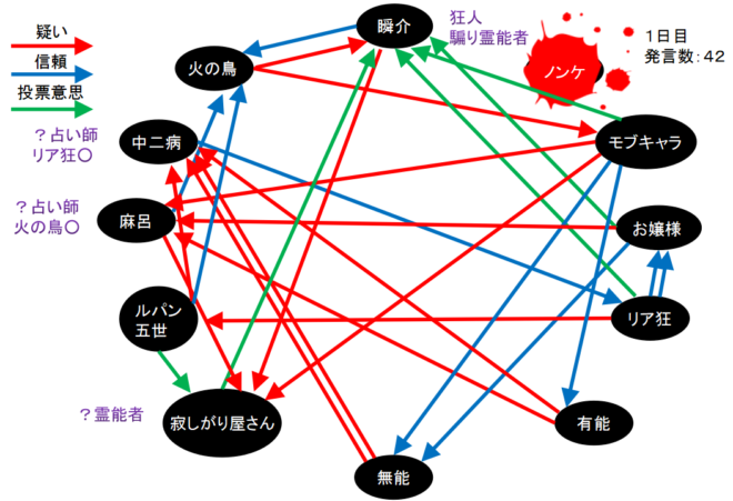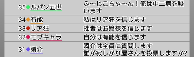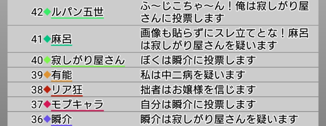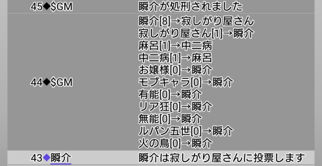 瞬介「ルパンから麻呂への矢印が見づらい。すみません、次戦から修正します。うーん、俺が吊られるのではないかという情報以外は何ともいえないなあ。『僕は寂しがり屋さんを疑います』」