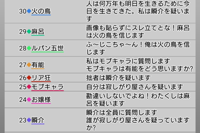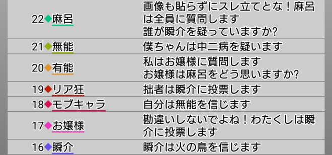瞬介「うわっ!人数が多いと発言も多い!俺が一人称を長く設定しすぎたせいで、よけい長く見えるのかもしれないけどさ(笑)。ええと?麻呂が2人目の占い師として登場したみたいだな。そして霊能者の俺と寂しがり屋さんは無視されている状況だ」