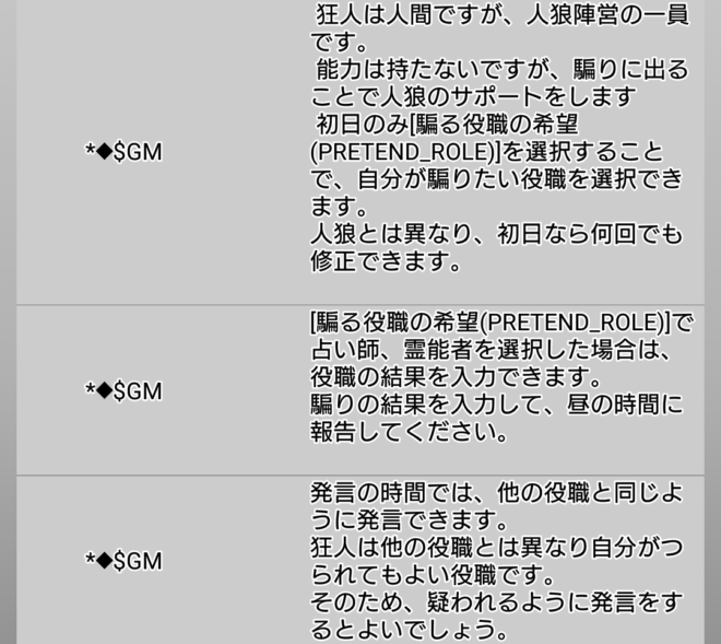 というわけで狂人と妖狐の説明は終了となります。人狼をやったことがない人は「何を言ってんのこいつ」って感じの説明だったと思います。人狼をやったことのある人も「何言ってんのこいつ」って感じに思われるでしょうけれども(笑)、私はよくわかってないのでとりあえずゲームを始めてみましょう。