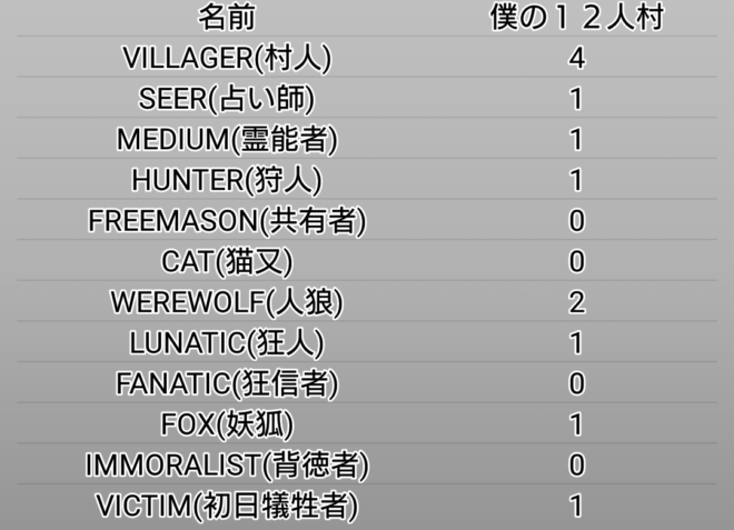 とりあえずやってみよう。本音を書けば狂人で10回くらい遊んで慣れた後にゲームをプレイしたかった。時間の関係でぶっつけ本番だ。12人村はすでに作っておいたよ。