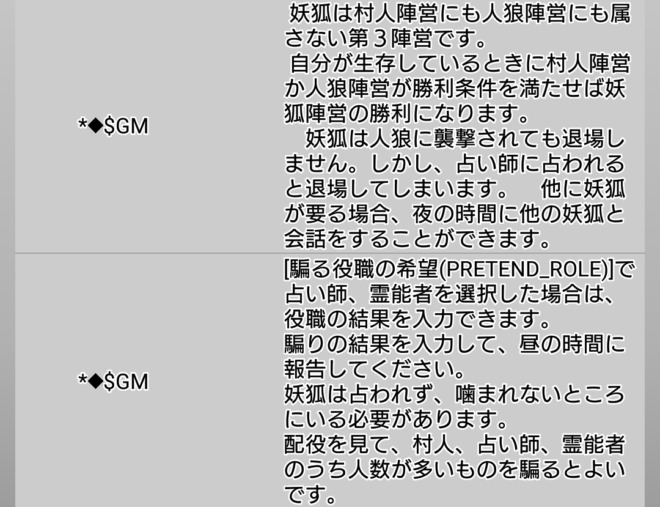 瞬介「9人村から村人、狂人、妖狐が1人ずつ増えている。吊りは5回なんだな。妖狐という役職は説明が難しくて・・・とりあえず公式の説明によると」