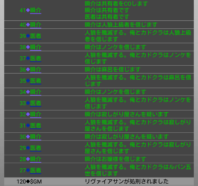 まだ共有者が2人とも生きているなんて嬉しいな。16Dの共有者戦では何もできないまま無残に噛まれまくったのに。