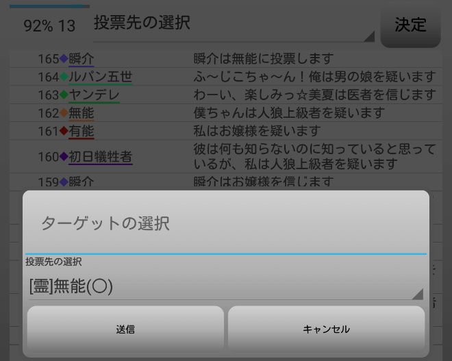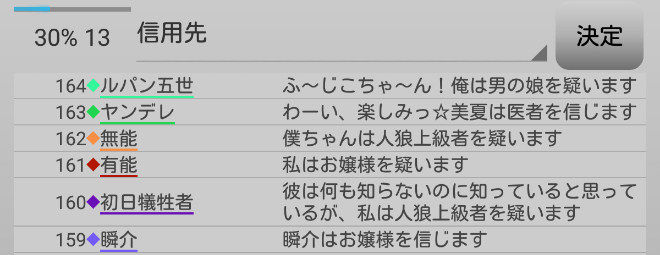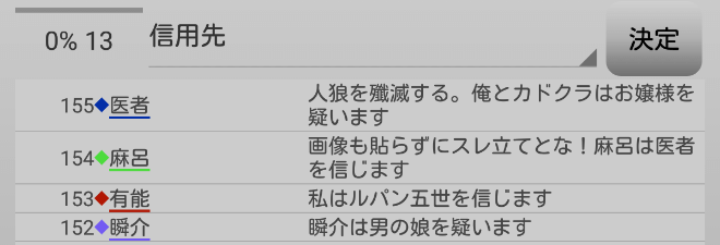 有能から誰を信頼しているか質問が来ている。真占い師を信頼しようぜ。俺は『お嬢様を信頼します!』。