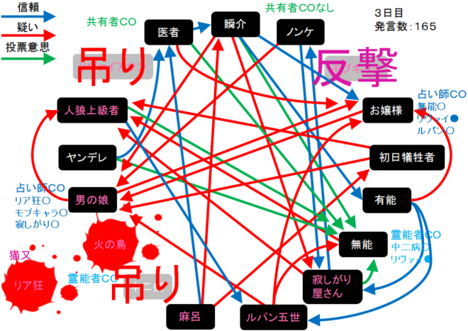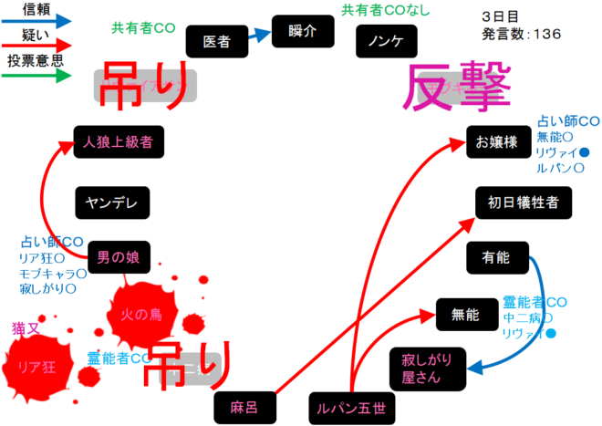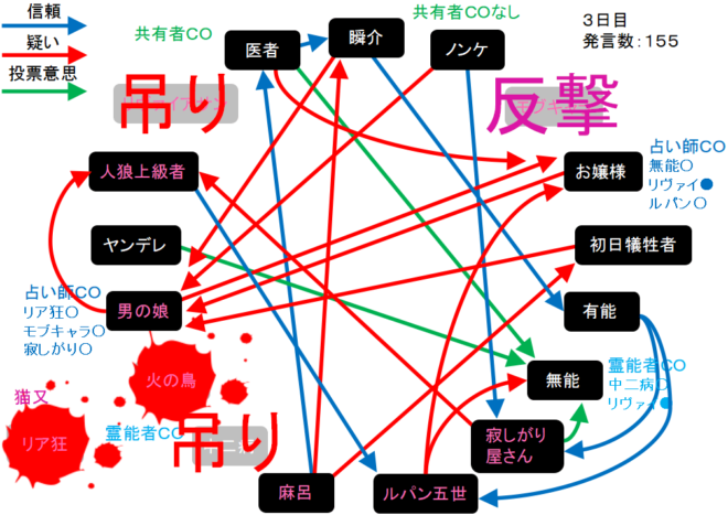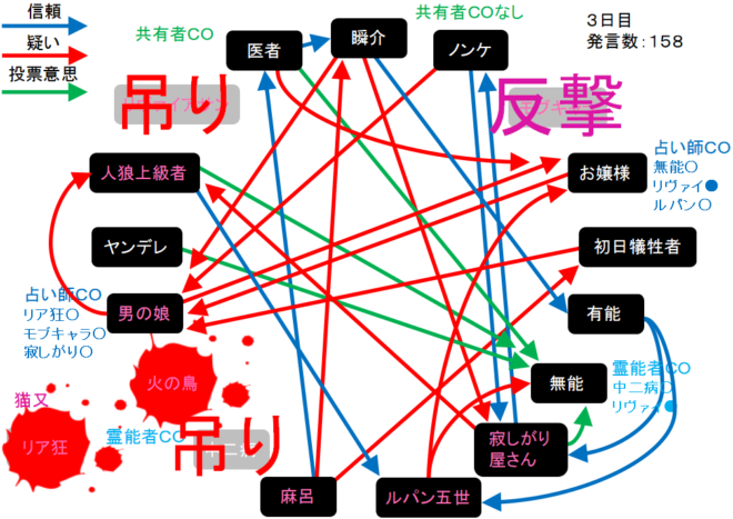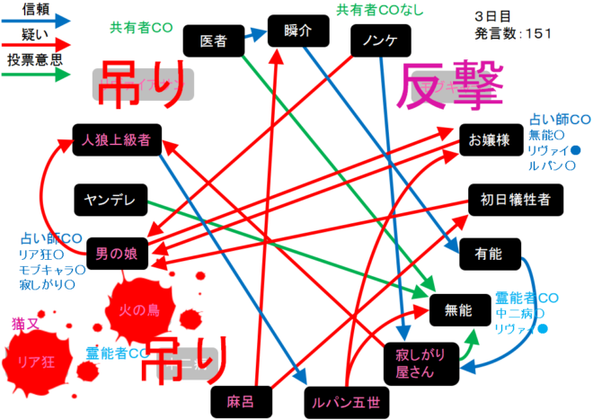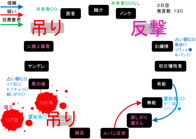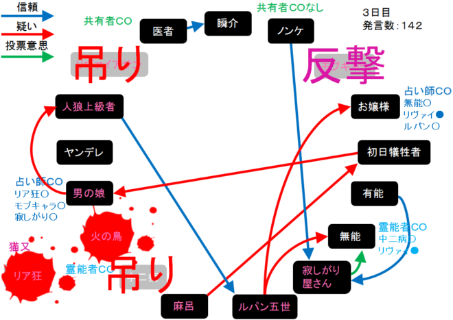 人狼の配役は『男の娘(偽占い師)、モブキャラ(猫又から反撃)、リヴァイアサン(処刑)された)、寂しがり屋さんだ。ルパンは投票により人狼候補からはずれた。