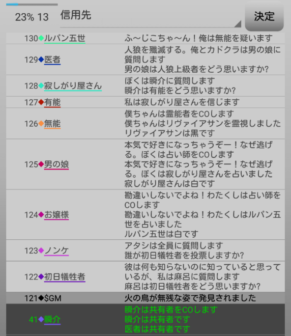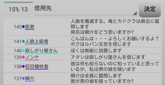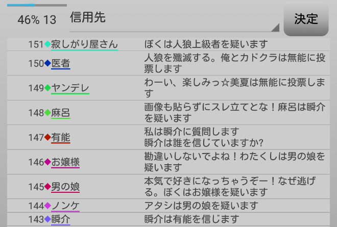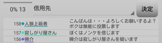 瞬介「寂しがり屋さん(人狼)から有能をどう思っているのか質問が来ている。有能を信頼しよう。人狼達は俺を警戒するはずだ。俺は『有能を信頼します!』」