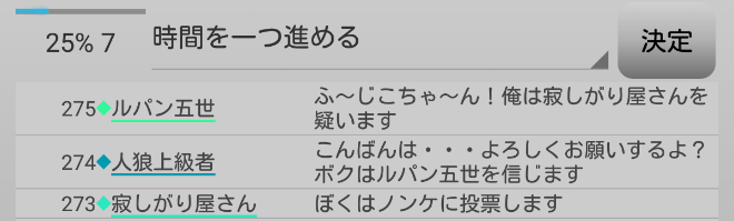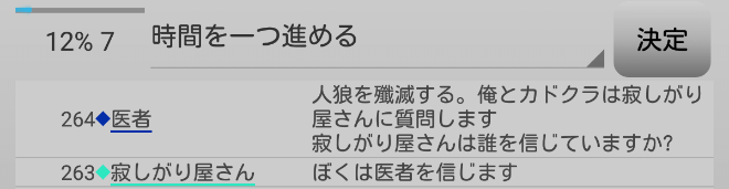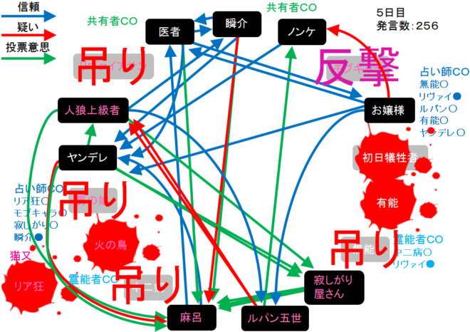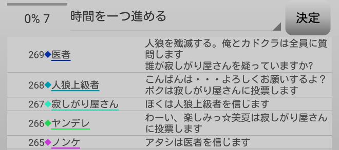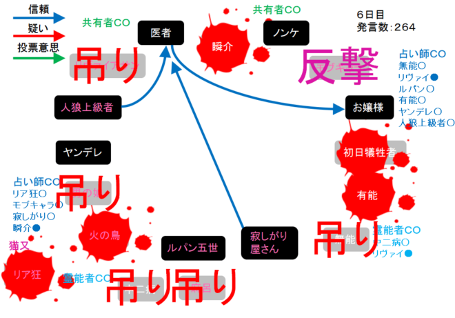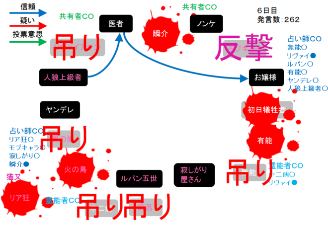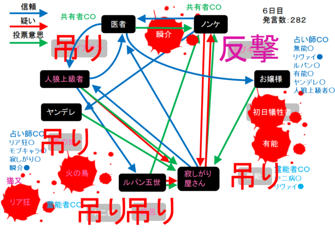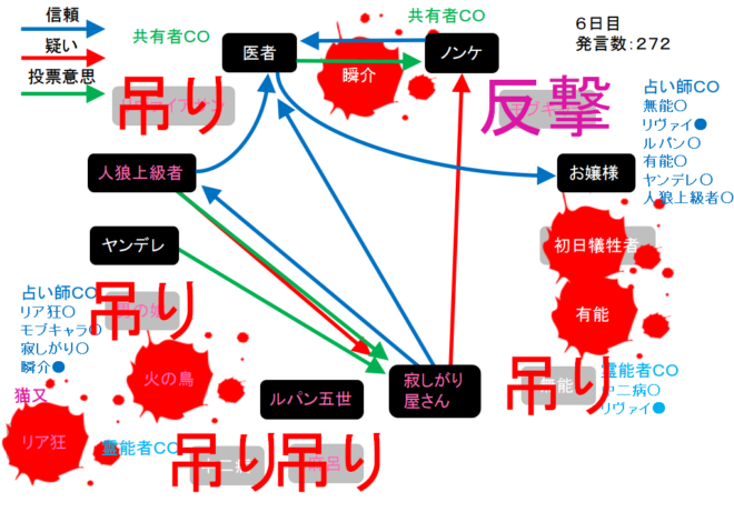 6日目になると共有者の信頼度も下がっているだろう。ヤンデレや人狼上級者の発言力に押し切られて寂しがり屋さん処刑になるか?次にいきます。