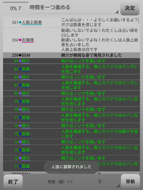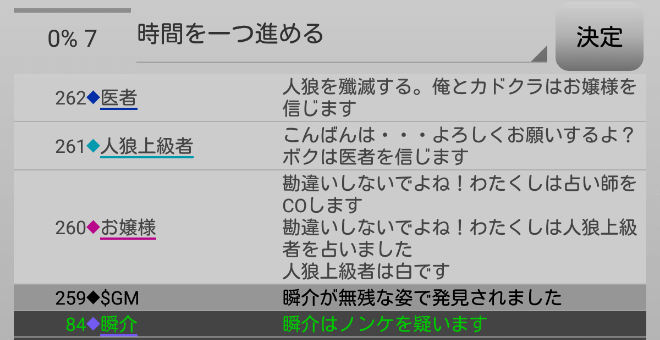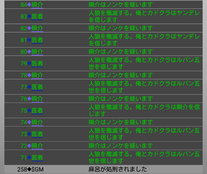 処刑対象はノンケと寂しがり屋さんだ。ここでノンケを処刑すれば必勝。寂しがり屋さんを処刑したとしても、麻呂が妖狐ならば勝てる。次にいきます。