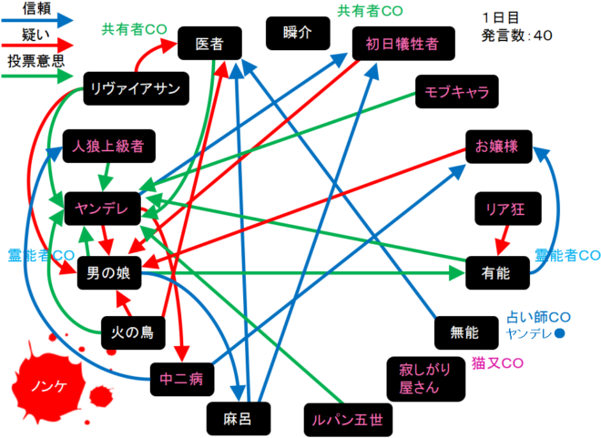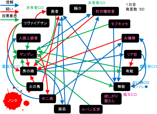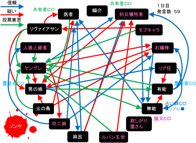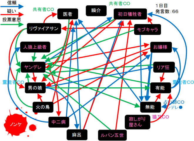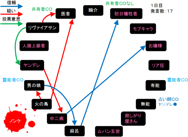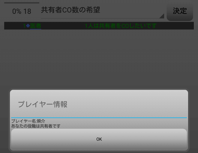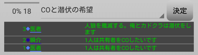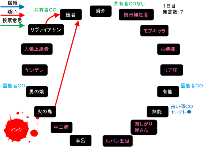 瞬介「1日目のCO数を1にしました(上の図)、俺が潜伏共有者を担当しよう。医者がCOを担当だ(前回と同じ)」