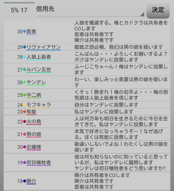 瞬介「今日の投票で人狼の配役がわかりそうだな。2日目以降も生存して吊り先を導きたいね。1日目は潜伏して噛み対象から逃れるのもアリだったかな(泣)?」