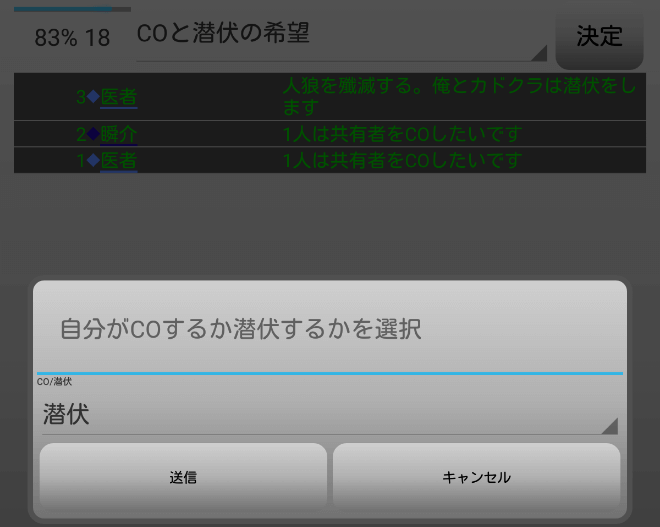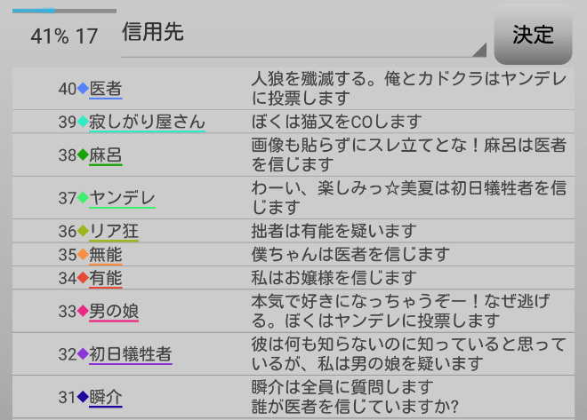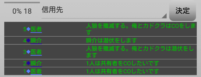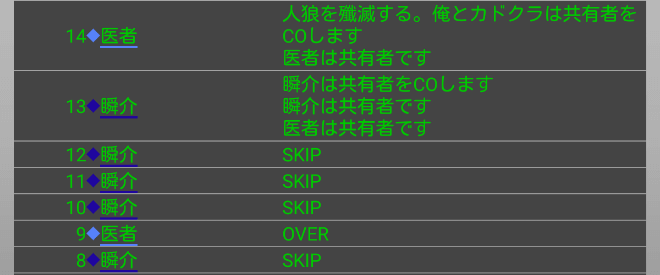 瞬介「俺が潜伏、医者がCOで合意をしました(上の図)。さっさと1日目を開始しよう」