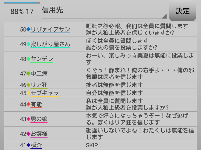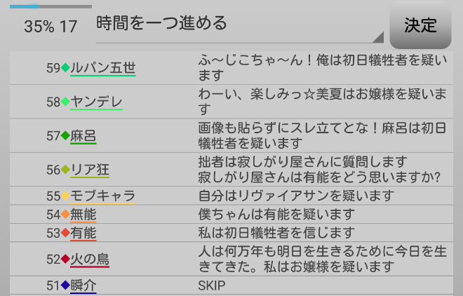 確定○から噛まれるのだ。そんなに上手くはいかねえだろ!やっぱり村陣営は厳しいよなあ。『スキップ』します。