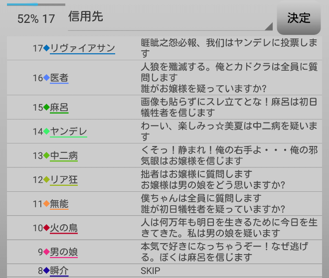 瞬介「2人の霊能者は『真』-『狂』なのかな?人狼達の様子をみよう。『スキップ』します!」